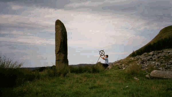 The Author measures the angle and height of the ancient navigational Monolith. The scale is weighted and points to the center of the Earth. This allows the angle to be read directly. The height can be calculated if the distance to the base is known. This Monolith is located at the head of a Scottish loch and is an ideal location for mariners to embark on a sea voyage. |
